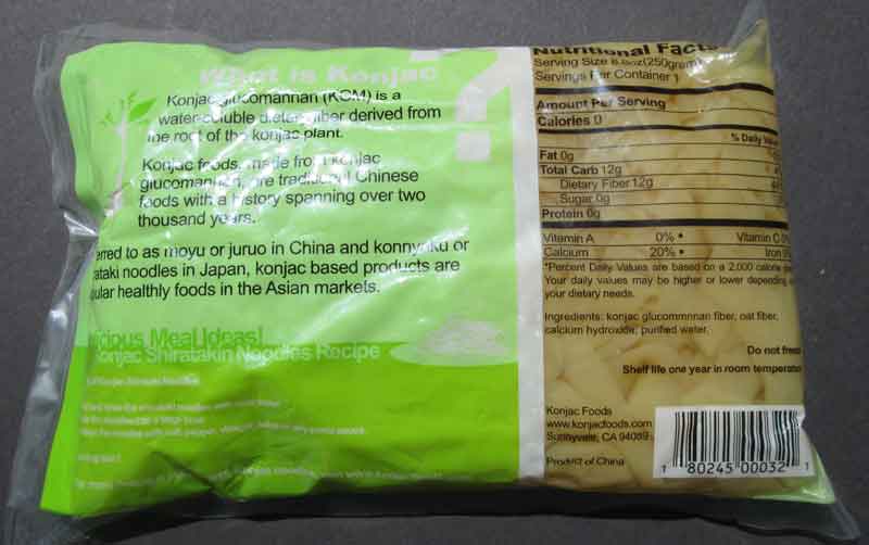 Traditionally konjac noodles, also known as Shirataki noodles or Konnyaku in Japanese, have zero calories, are transparent and look similar to Chinese glass noodles, however the traditional konjac noodles have a rubbery texture and are sometimes unable to absorb all flavors.